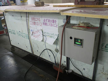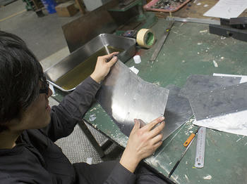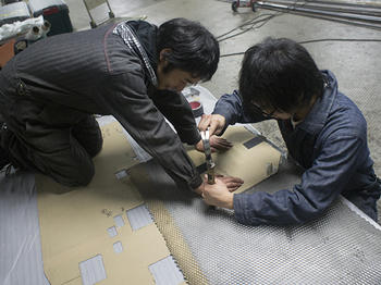その焼いている間にモノコックの中にいれるハニカムを切っている前見君と多胡君です。