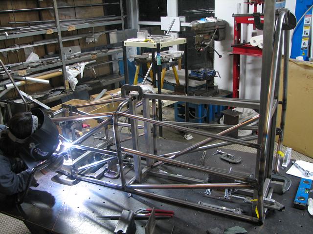 現在、フレームは写真のような進行状況です。メインフープからフロントにかけてはほぼ完成しました。残るはリアセクションとブラケット類の溶接です。3月のシェイクダウンに向けて急ピッチで製作を進めています。